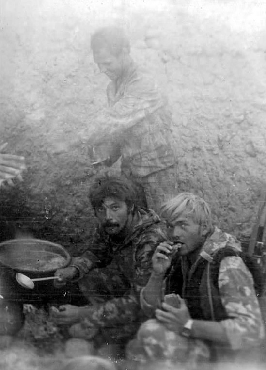 Ложек было несколько. Мы передавали их друг-другу по кругу. Солдат засовывал в рот кусок лепахана, заливал пару ложек супа в хлеблушу и передавал инструмент товарищу, пока сам совершал жевательные движения. Не могу себе представить, чтобы в Союзе «молодые» солдаты были бы допущены жрать за одним столом с «дембелями». Да ещё к тому же одной ложкой. Но в Абдуллахейле такое оказалось возможным. По сроку службы я был «молодой». «Дембеля» сготовили отличную, офигенную жрачку, я не готовил, но жрал, меня кормили «дембеля»! Почему в Союзе так не поступали? Что сделалось с армией в Союзе? В такой огромной Стране недостаточно умных Рогачевых? Ни за что не поверю.