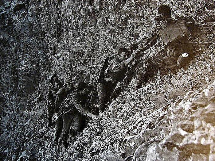 По команде Рогачева рота поднялась с позиций и двинулась из зелёнки к Черной Горе, я не стал скулить и валяться на тропе, стиснул зубы, подошел к, вертикальной стене из камня и подумал – за что же тут ухватиться? Хвататься было не за что, я перекинул пулемёт с правого плеча за спину, поднял вверх руки, согнул пальцы крючками и, как только они за что-то непонятное зацепились над головой, полез, блин, вверх. За что цеплялся – не понял, вспомнил дурацкий совет, мол, не надо смотреть вниз, иначе закружиться голова… Это полная ерунда, а не совет. После того как я поднялся на несколько десятков метров по вертикальной, раскалённой на солнце черной стене, фактически, с пианиной на горбу, голова закружилась и без взглядов вниз. Пальцам моим пришел трындец, дыхалке - трындец, ногам - трындец, они тряслись от напряжения, а присесть и передохнуть на тубареточке никак не получалось. Потому что не бывает табуреток на скалах с уклоном 81,6 градуса.