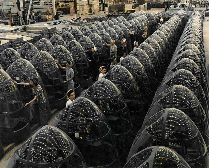 Сборка носовой части бомбардировщиков Дуглас А-20 на заводе Douglas Aircraft Co, 1942 год.