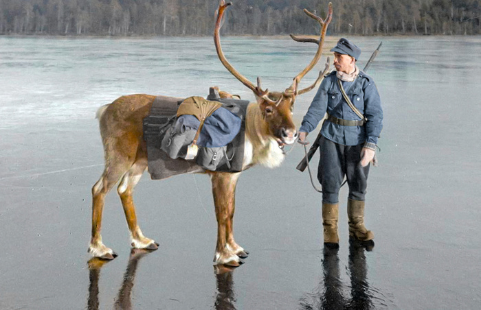 Солдат и северный олень на льду в северной Лапландии, Финляндия, 26 октября 1941 года.