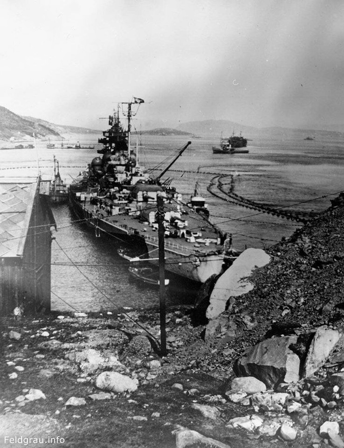Снимок показывает фантастическую глубину норвежских фиордов - "Тирпиц" стоит у самого берега