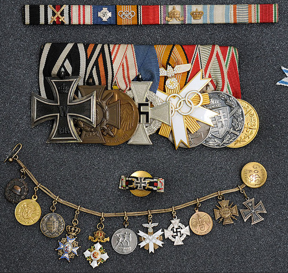 Три вида оформления наград Рейха для ношения на повседневном мундире (планки), на парадном - полная колодка с полноразмерными наградами и миниатюры для ношения на фраке.