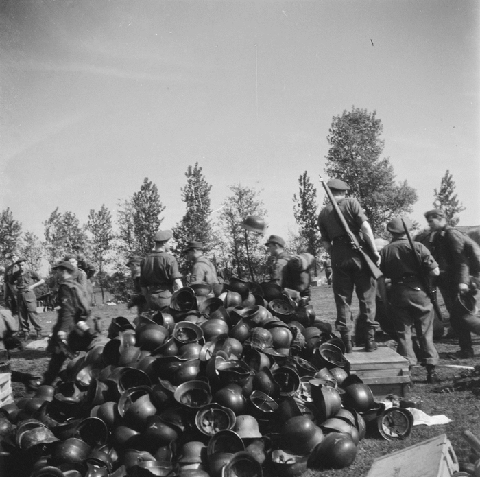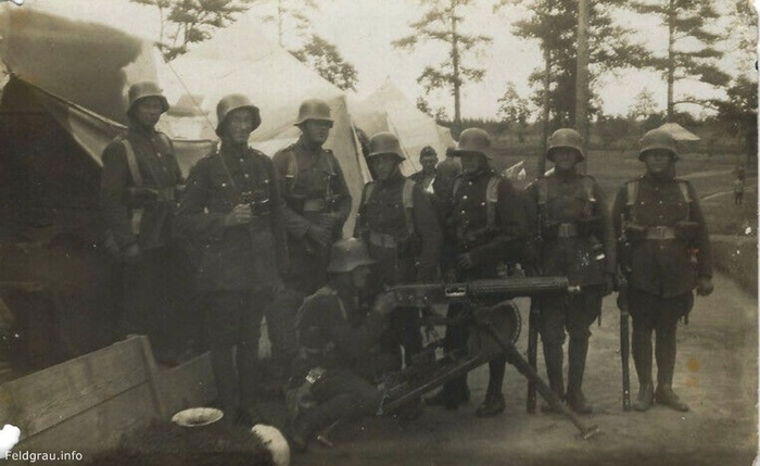 Ребята позируют, конечно, для корреспондента, но фото интересное. У крайнего слева занятная машинка в руках, - трофейный австрийский Steyr-Solothurn S1-100.