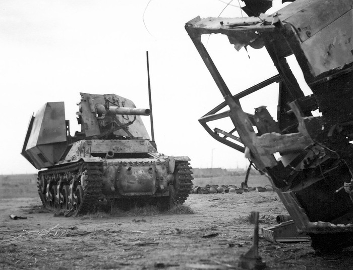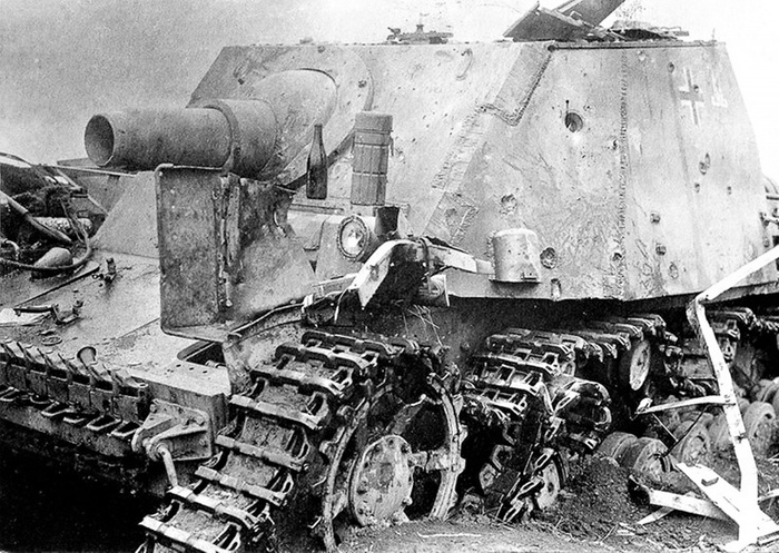 Разбитая самоходка "Ворчащий медведь". Отлично видны на броне следы не пробитий. Однако все эти удары вызывали массу поломок - от сотрясения танк портится не хуже, чем часы, например.
