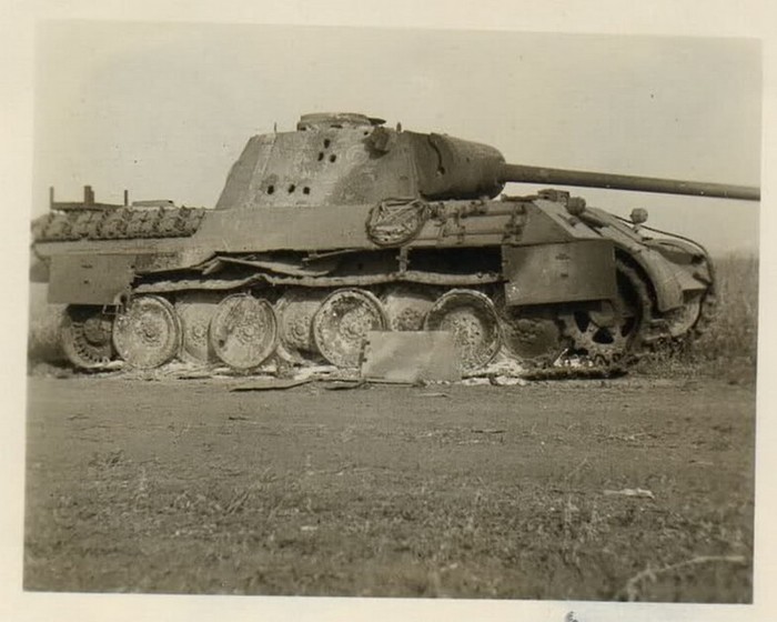 Сгоревшая пантера. Хорошо видны пирамидки пепла от сгоревшей резины с колес. И заметно, как сгоревший танк "сплющивается".