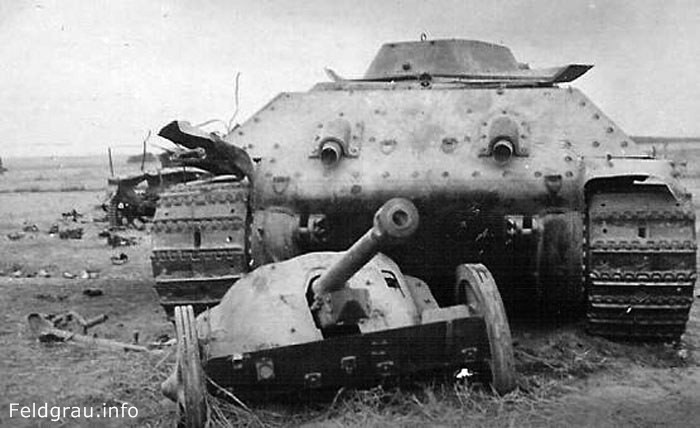 Таран. Т-34 раздавила 50 мм. ПТО. Непонятно что за техника торчит слева за танком.