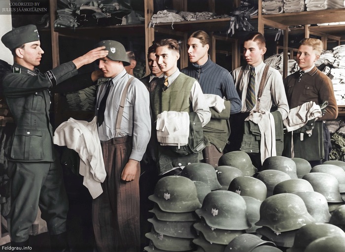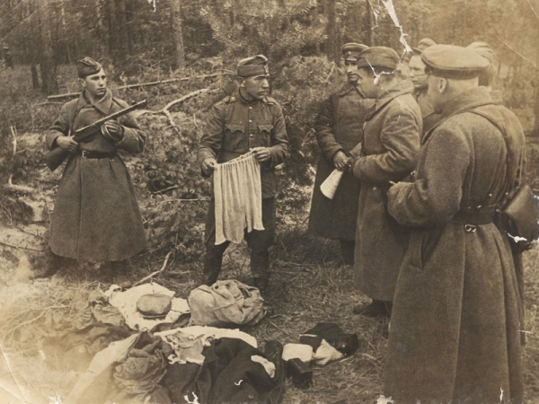 Наши разбирают трофеи. И оказалось, что у немца с собой много женских шмоток. нет, не трансвестит, банально мародер. Посылки они домой посылали знатные.