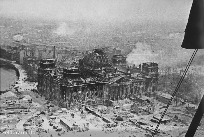 Рейхстаг с птичьего полета. У входа стоит французский трофейный танк, принимавший участие в обороне.