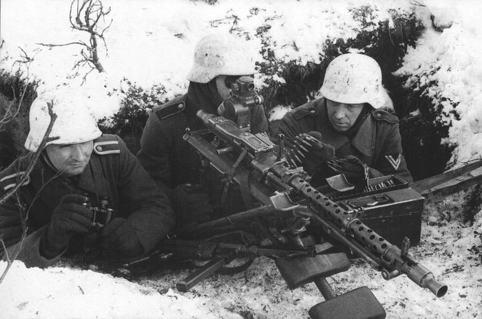 Расчет станкового пулемета МГ-34, обратите внимание на прицел.