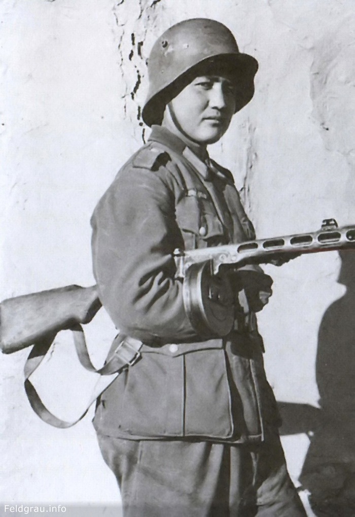 Зольдат из Восточного легиона. Чем больше были потери у немцев, тем охотнее они набирали такое - всякое. Но надежды не оправдались, эти войска из предателей в боевом отношении были хуже румын.
