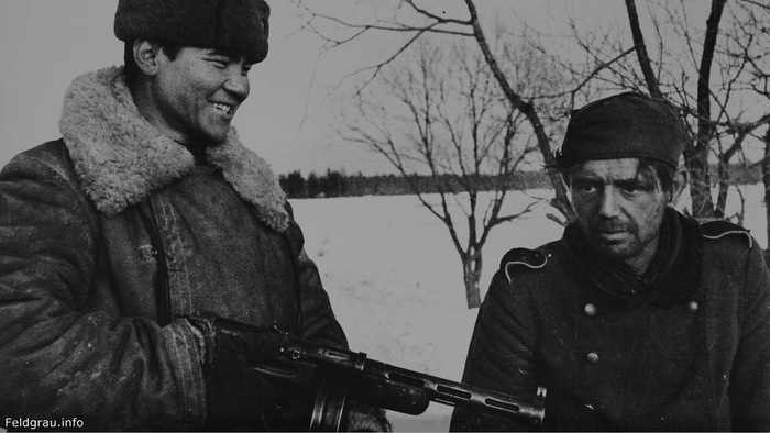 1942 год. СССР. Боец 311-й стрелковой дивизии РККА, вооруженный пистолетом-пулеметом ППД охраняет взятого в плен немецкого солдата.