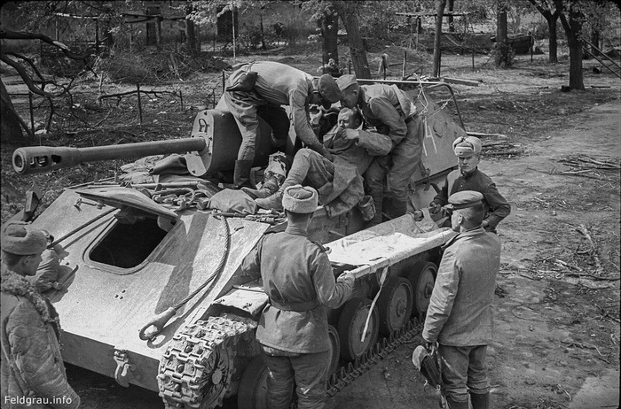 Апрель 1945 года. Германия. Раненого советского бойца перекладывают с САУ СУ-76М на носилки под Берлином.