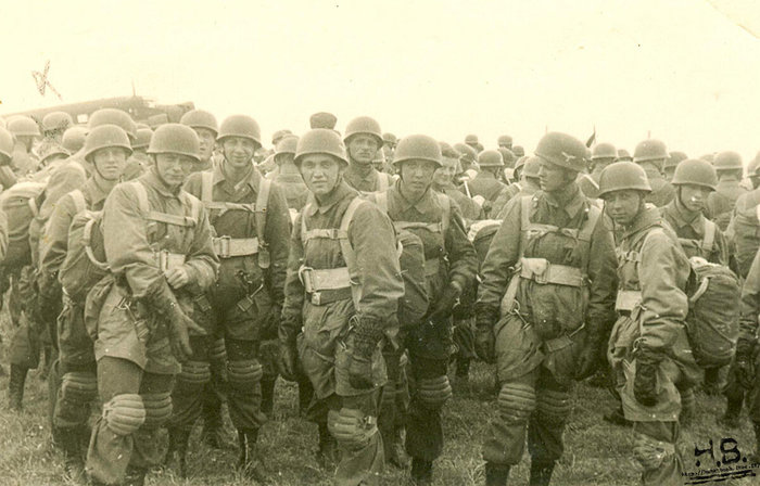 Парашютисты. Парашюты у немцев были дурацкие - приземление предполагалось на четвереньки - много поврежденных коленных и локтевых суставов. И прыгали только с пистолетами и ножами - оружие сбрасывали в контейнерах вместе с солдатами.