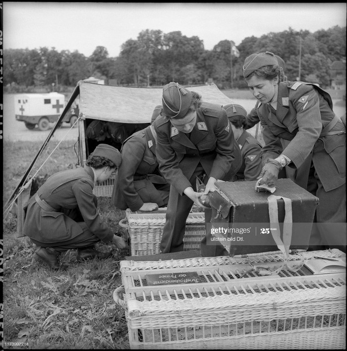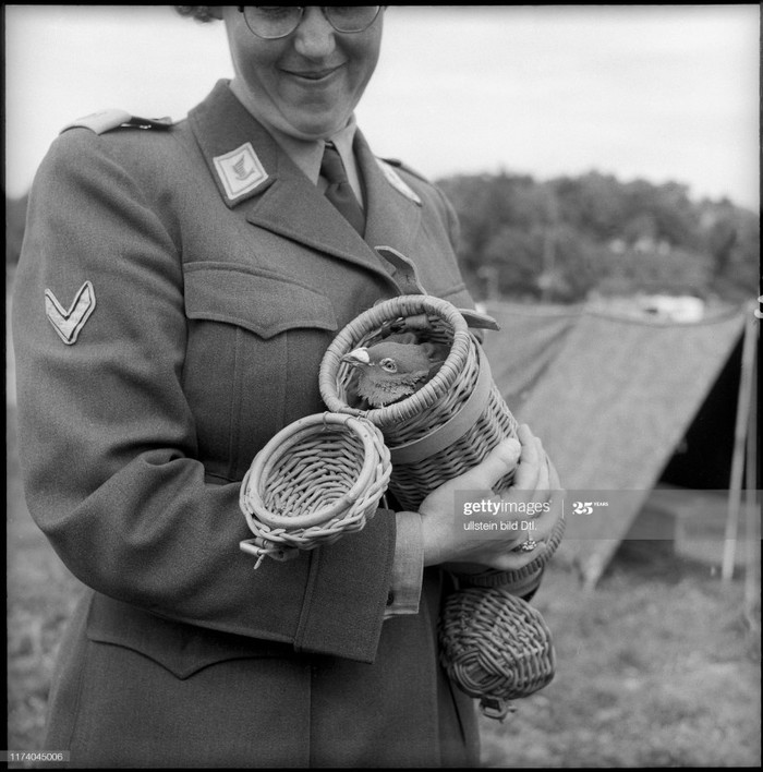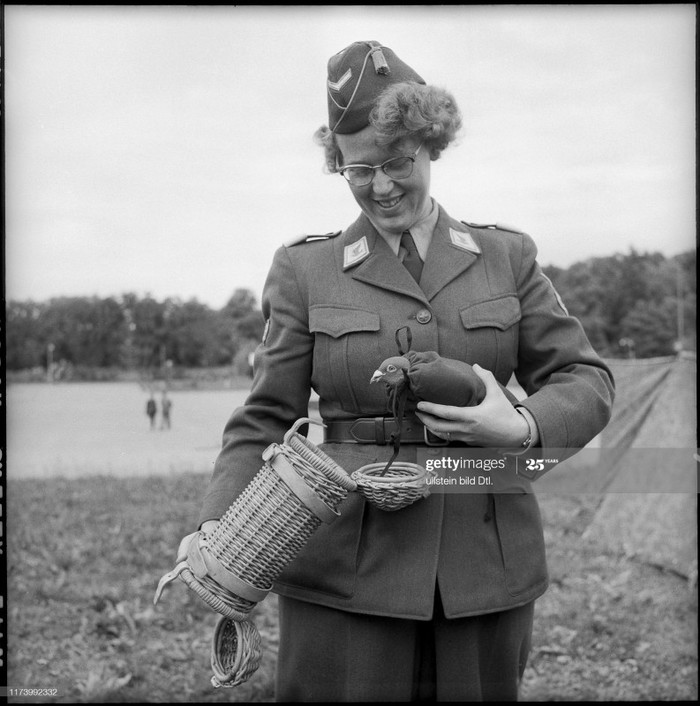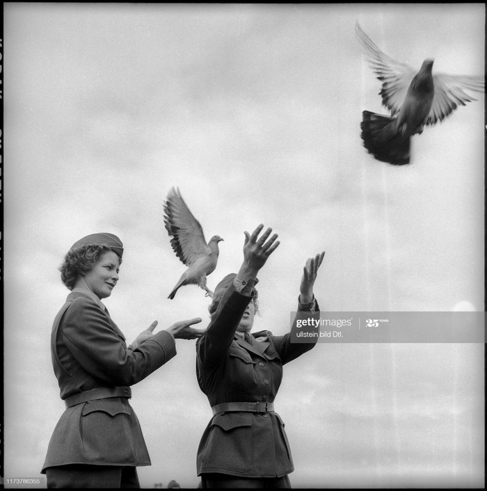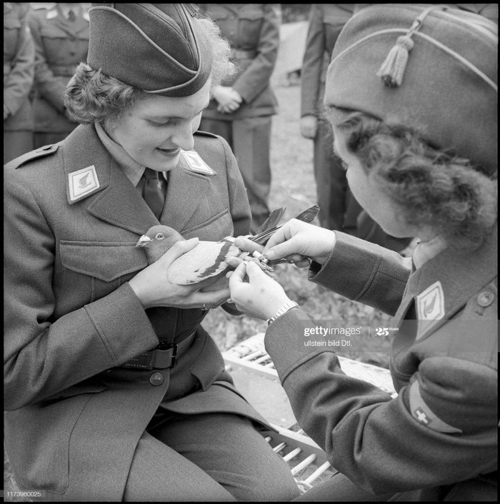 Сеанс связи. Интересно, как назвать этих связисток? Голубистки? И еще кажется мне. что у повоевавших в ВМВ армий уже такой экзотики не было.