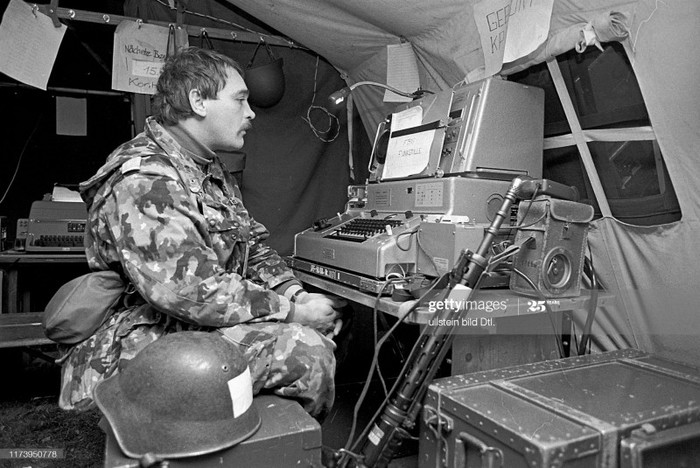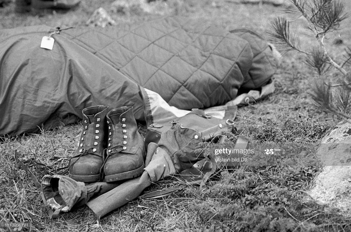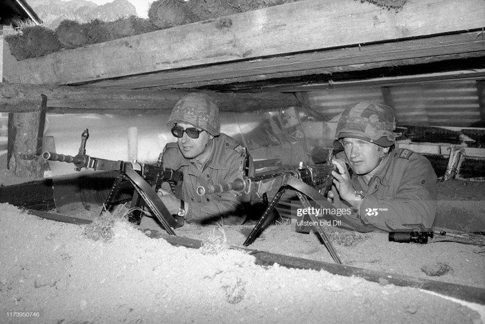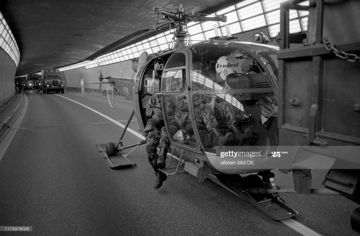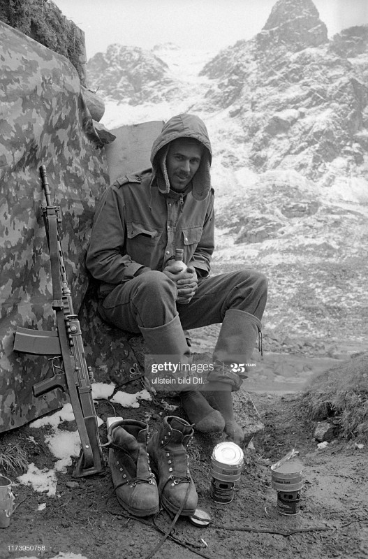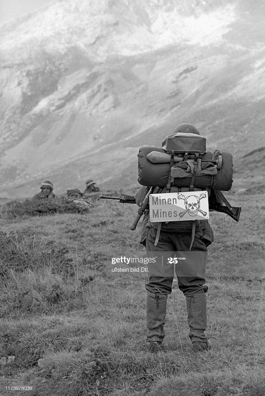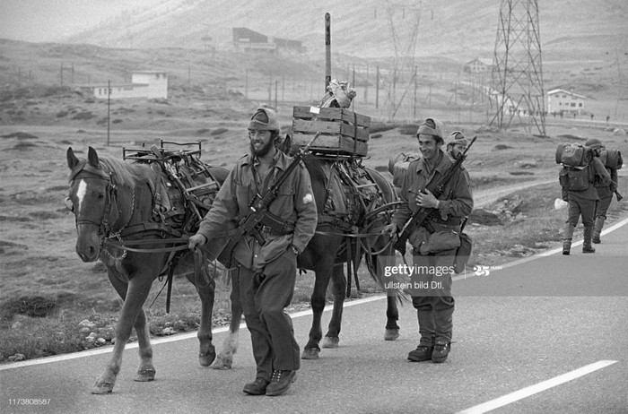Подразделения швейцарской армии во время проведения осенних манёвров в кантоне Граубюнден в восточной части Швейцарии; октябрь 1981-го года