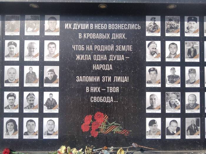 Прошел к Дому правительства. Справа от главного входа — большая черная мемориальная плита. На ней — множество фотографий. Почти все — мужчины в военном, выглядящие, впрочем, подчас вовсе не традиционно армейски (армейское фото — это строгий анфас в парадной форме). Позы у многих вольные — камера запечатлела многих едва не случайно, в естественном движении жизни. Лица очень разные — молодые и зрелые, хмурые и веселые, скромные и нагловатые, красивые, словно у античных полубогов и грубые, помятые жизнью. Это ополченцы, погибшие в 2014–2015 годах. Среди них затесались несколько гражданских, женщины — те самые, что были убиты ударом с самолета в паре шагов отсюда. Тут можно взглянуть на них, какими они были.