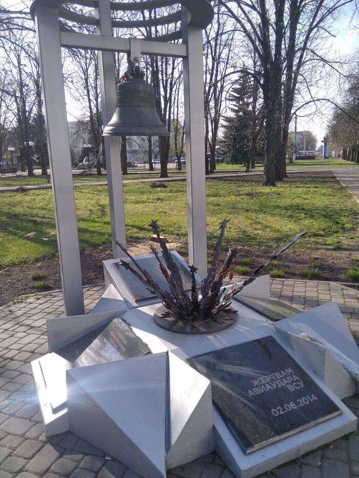 Полчаса пешего пути, и я на месте. Через дорогу белостенное здание правительства ЛНР. А передо мной два памятника. Небольших, скромных, но очень талантливо и искренне созданных. Один — это запечатленный в металле взрыв. В разные стороны разлетаются острые смертоносные звезды-осколки. По четырем сторонам гранитные таблички с именами убитых тогда. Почти все — женщины. Над табличками небольшой церковный колокол. Заглянул в него в поисках языка — имеет ли колокол голос? Нет языка — зря. Подойдет так своеобразный паломник, вроде меня, к трагическому историческому месту, тронет колокол — и понесется по скверу тихий звон. Сообщая округе — помните. Не забывайте…