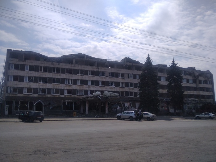 Даже в обед на автовокзале было пустынно, работала всего одна касса. Сел в автобус строго по расписанию. Через полтора часа уже в Красном Луче. У автостанции заскочил в маршрутку, проехал чуть больше, чем нужно было, сошел у гостиницы, по которой пришелся ракетный удар еще летом. Стремления не было, так вышло случайно. Однако не пожалел. От покореженного здания пахло войной — снова напоминание — где мы, что происходит. Пригляделся к нему получше. По крыше словно били огромным огненным молотом — она измята, обожжена, местами провалена, вбита на пролет вниз. Остальные этажи в общем целы, вылетели только стекла. Особо досталось небольшой передней пристройке, где был парадный вход. Видимо, по нему прилетела отдельная ракета — бетонный короб разнесен в клочья, оголилась, словно скелет, покореженная арматура.