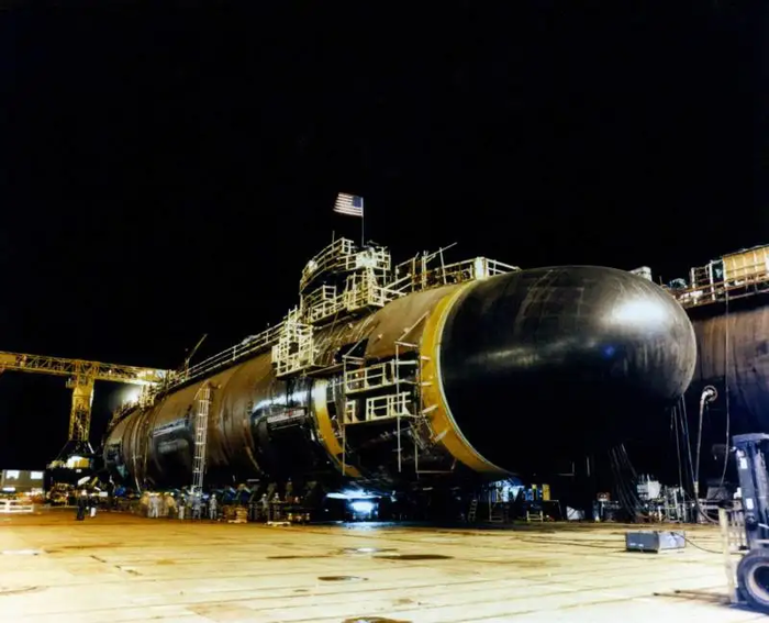 Головная лодка проекта USS Seawolf (SSN-21) в ходе строительства, 24 июня 1995 г. Видны бортовые антенны ГАК