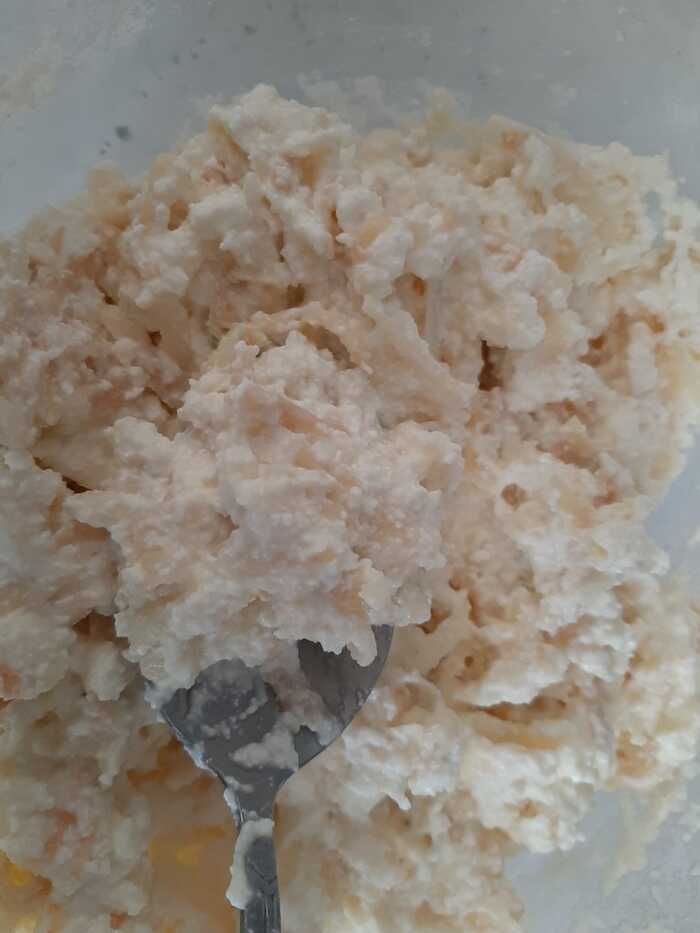 Творог выложить в миску, добавить яйца, соль, сахар. Размешать.