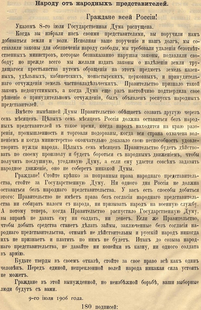 9 (22) июля депутаты, явившись в Таврический дворец для участия в работе Думы, нашли дворец закрытым. Неподалеку на столбе был приколот манифест о роспуске первой Государственной Думы. В тот же день порядка 200 депутатов, главным образом от партий кадетов, трудовиков и социал-демократов, отправились в Выборг для проведения специального совещания. Столица кишела полицейскими и собрания депутатов распущенной Думы могли спровоцировать аресты. С точки зрения безопасности в финском Выборге полицейское вмешательство казалось минимальным.