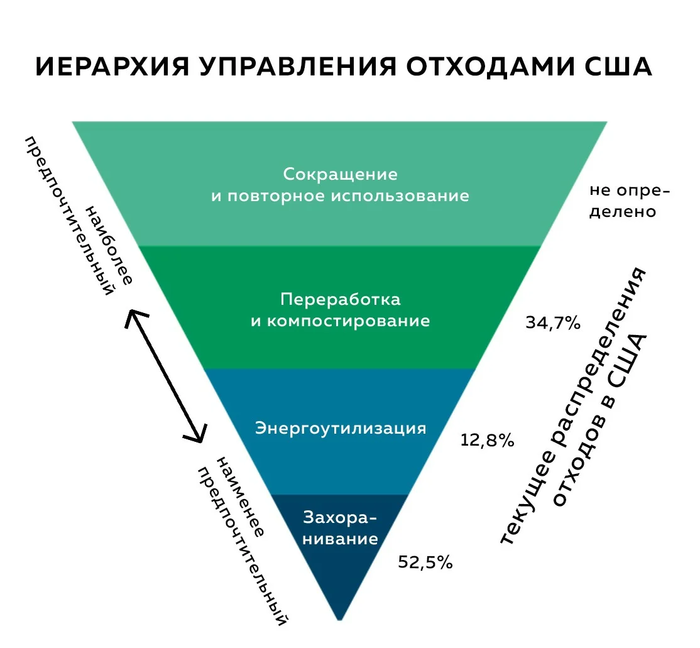 В 2019 году Агентство по охране окружающей среды США (EPA) приняло иерархию устойчивого управления твердыми отходами. Как и в европейской схеме, энергоутилизация поставлена выше захоронения.