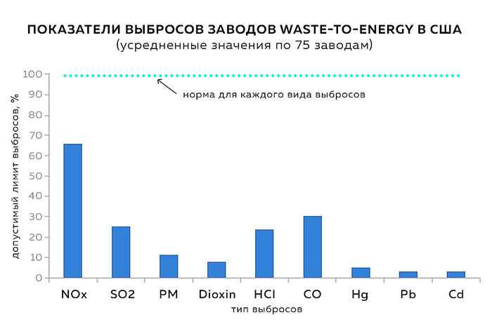 В среднем концентрация вредных веществ в выбросах современных заводов waste-to-energy оказалась на 70% ниже действующих норм. Исключение составил только показатель NOx (оксида азота) — он на 35% ниже стандартов. Причем результаты американских исследований мало чем отличались от общемировых.
