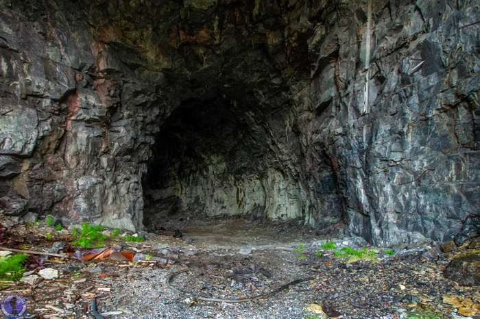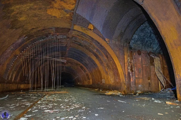 Спускаемся по мокрым камням в котлован и движемся к порталу. На самом деле на фото их два, просто нижний портал засыпан и из грунта торчит лишь его верх слева от не засыпанного портала. А должен был быть ещё и третий ещё ниже справа, но его не успели пройти, т.к. котлован не достиг максимальной проектной глубины.
