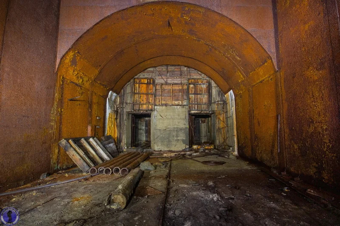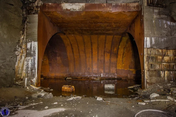 Возвращаемся обратно в главный тоннель. Здесь должны были быть установлены огромные многотонные двухстворчатые выпуклые защитно-герметические ворота. Для них даже успели смонтировать дверную коробку и петли.