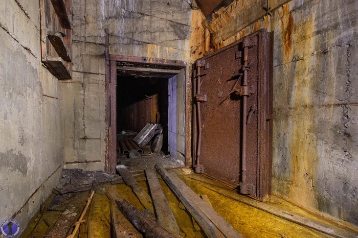 Левый тамбур. Здесь установлено две защитно-герметических двери весом под тонну каждая. Правый тамбур также был оснащён двумя аналогичными гермодверями..