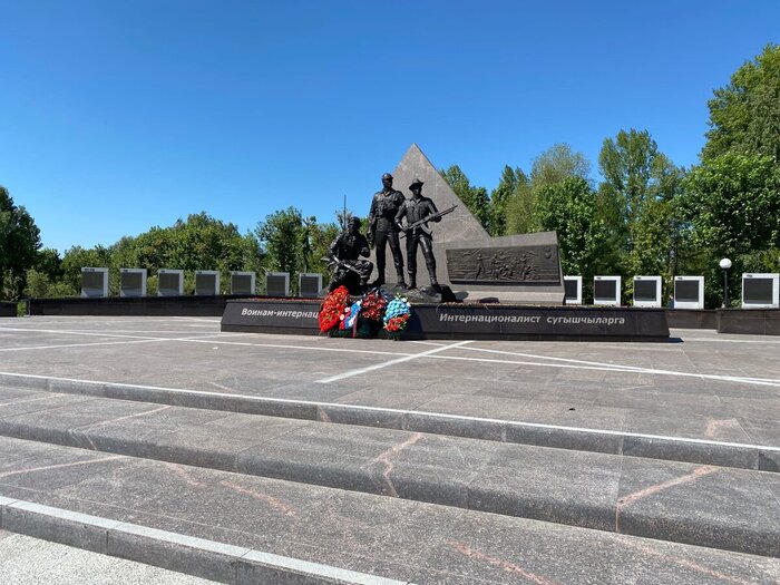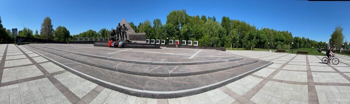 …Наконец-то прибывает наш проводник. Документы проверены, нас допускают на «режимный объект». Мы ожидали увидеть сразу же за проходной могилы воинов — но ошиблись. Впереди простиралось огромное практически пустое пространство, разрезанное прямой дорогой, уходящей вдаль, к какой-то серой арке, построенной в виде полукольца. По бокам этого неширокого шоссе — ряд столбов, увенчанных