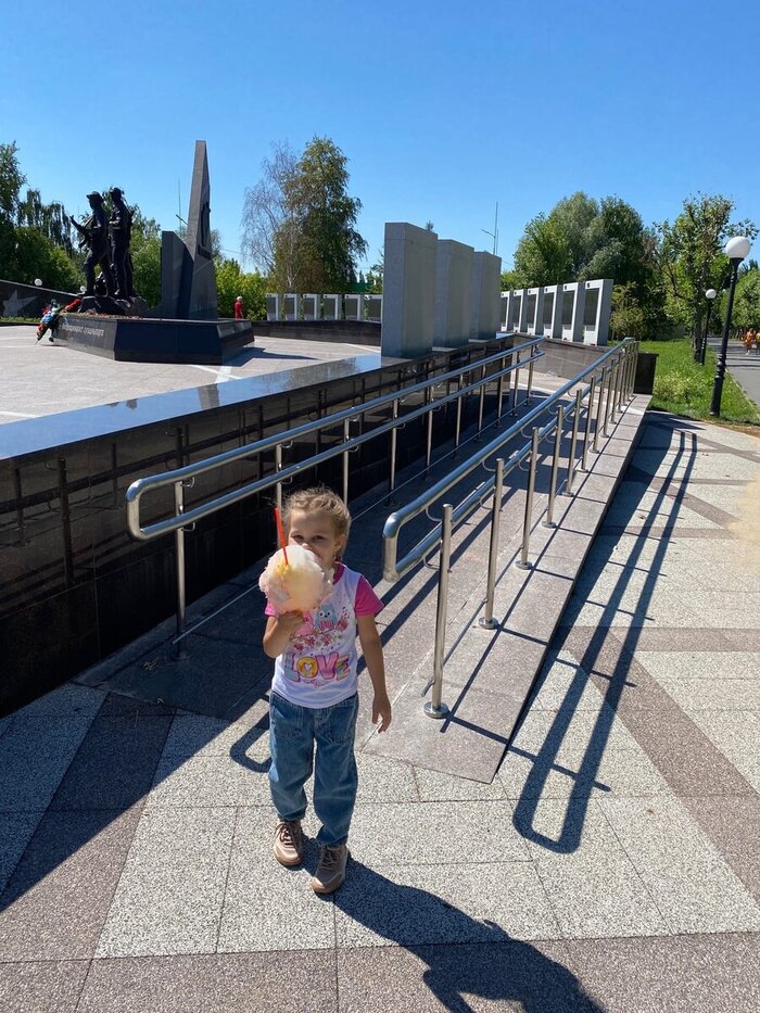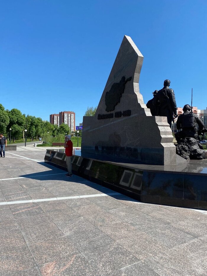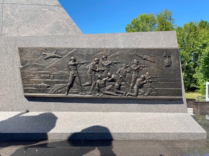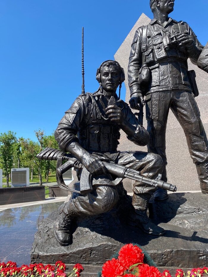 Идём дальше по территории мемориала. Проходим между четырьмя массивными квадратными тумбами из полированного чёрного камня. Каждая из них посвящена одному из родов войск. Наверху тумбы — круг с надписью: «Сухопутным войскам», «Военно-морскому флоту»… На углу каждого из монументов — «военный» двуглавый орел с щитом на груди: святой воин Георгий поражает копьём змея. Егор начинал воинскую службу как морской десантник — вспомнилось, когда прочёл надпись на «военно-морском» кубе…