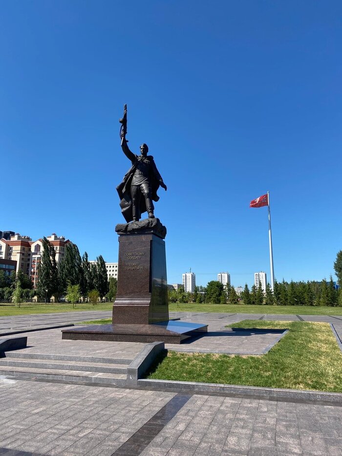 За тумбами начинается парк. Желтеют кроны русского «чернолесья», над которыми то тут, то там видны вершины вечнозелёных сосен, стройных, как часовые… По сторонам от дороги попарно расставлены каменные стелы, по бокам от которых — бронзовые фигуры русских воинов разных столетий. Вот — древнерусские витязи в кольчугах и шлемах.