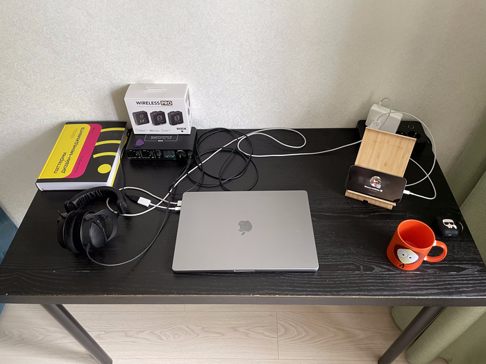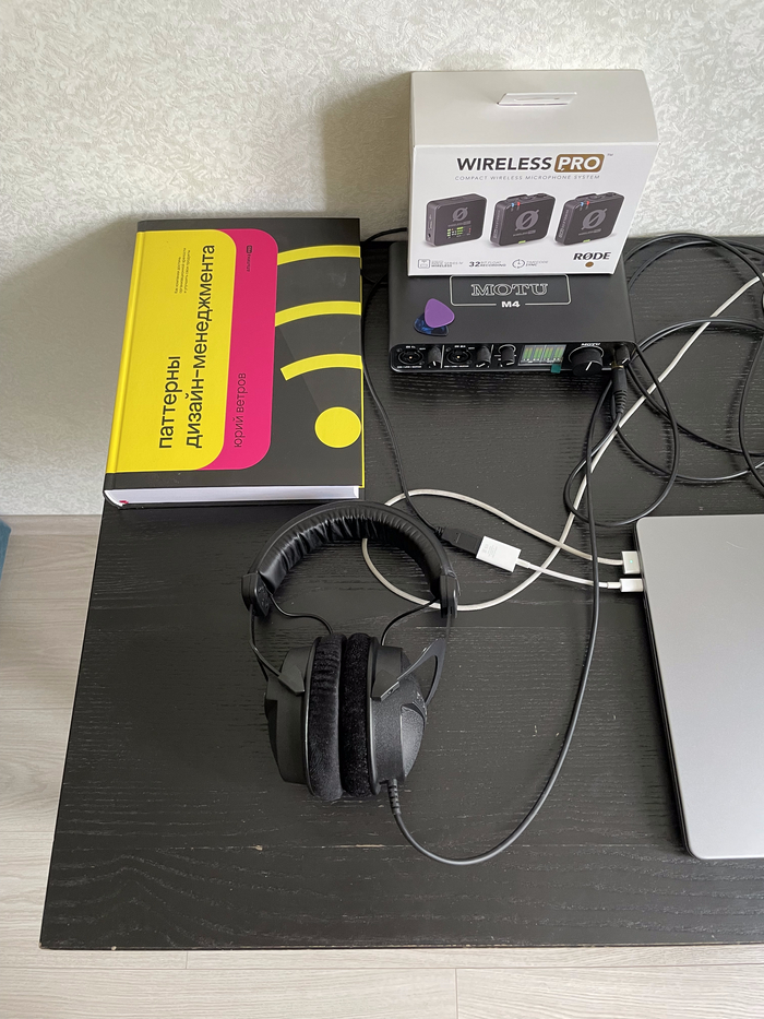 Я люблю музыку, раньше у меня была студия звукозаписи: играл в группе, была своя студия, даже небольшой лейбл был. Поэтому на столе лежит карточка motu m4 и наушники.