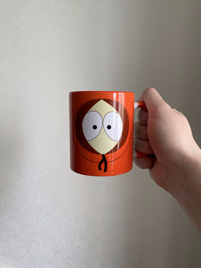 На столе не без кружки с Кенни, это мой любимый персонаж. Недавно даже татуировку с ним набил! Я люблю “Южный парк”, это мой мультик детства. У нас в школе у каждого была кличка из этого мульта. Недавно одноклассник подарил мне на новый год эту кружку, до этого мы не общались лет 8! А татуировку я набил прошлым летом.