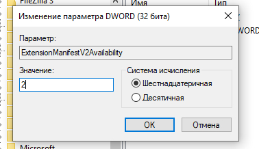3. В этом разделе создайте 32-битный параметр DWORD, и назовите его: ExtensionManifestV2Availability