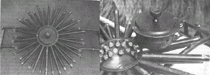 Внутри барабана находился затвор, представляющий собой цилиндрический механизм, внутри которого находились четыре кулачка (по два на каждый ряд стволов), приводящие в действие бойки. При этом стволы стреляли не в круговой последовательности, как можно было ожидать- вместо этого за каждые четверть оборота рукояти стреляло 9 стволов (если говорить о 36-ствольной установке), расположенных по кругу, что обеспечивало 360-градусное накрытие целей [9].