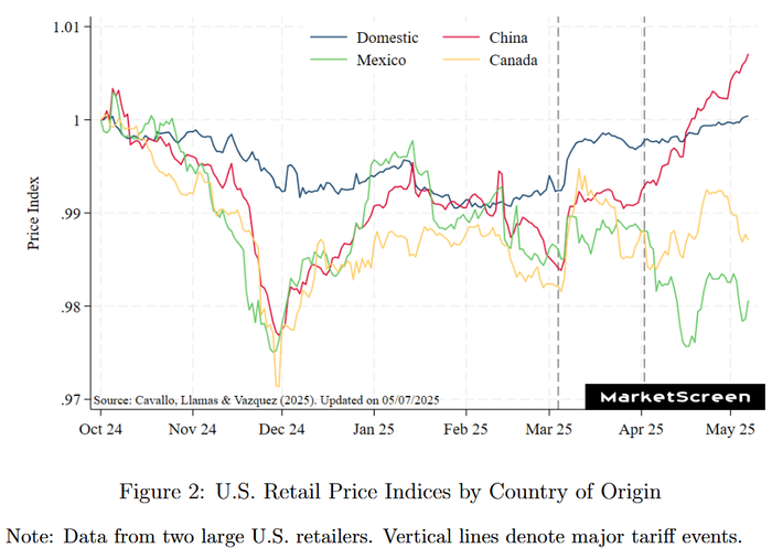 Тарифы 2025 года на китайские товары впервые вступили в силу 4 февраля и составили 10 %, но не оказали непосредственного влияния на розничные цены. Ситуация изменилась 4 марта, когда США ввели 25% тарифы на импорт из Канады и Мексики, а также дополнительные 10% тарифы на китайские товары. Сразу после этого цены на импортные товары выросли примерно на 1,2%, в то время как цены на отечественные товары выросли примерно в два раза меньше. После 2 апреля цены на импортные товары стали расти гораздо быстрее, что совпало с объявлением новых тарифов в «День освобождения».