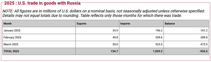 Оно, в смысле она, торговля, растёт, дорогие друзья. США импортировали к себе наших товаров на 523,5 млн $. А отправили нам на 50. Баланс получился 473,5 млн $ в нашу пользу.