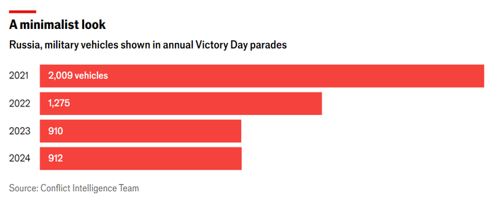 Число военных машин, представленных на парадах, сократилось с примерно 2 000 до войны до 1 275 в 2022 году и чуть более 900 в 2023 и 2024 годах. Танки встречаются еще реже: в 2021 году на параде было представлено 108 единиц, а в прошлом году - только 39. На московском параде был представлен всего один - Т-34 времен Второй мировой войны.