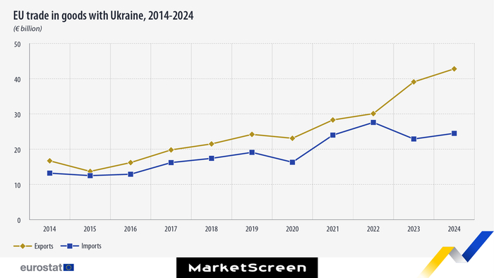 В 2024 году ЕС экспортировал на Украину товаров на 42,8 млрд евро и импортировал на 24,5 млрд евро, что привело к положительному сальдо торгового баланса в размере 18,3 млрд евро.