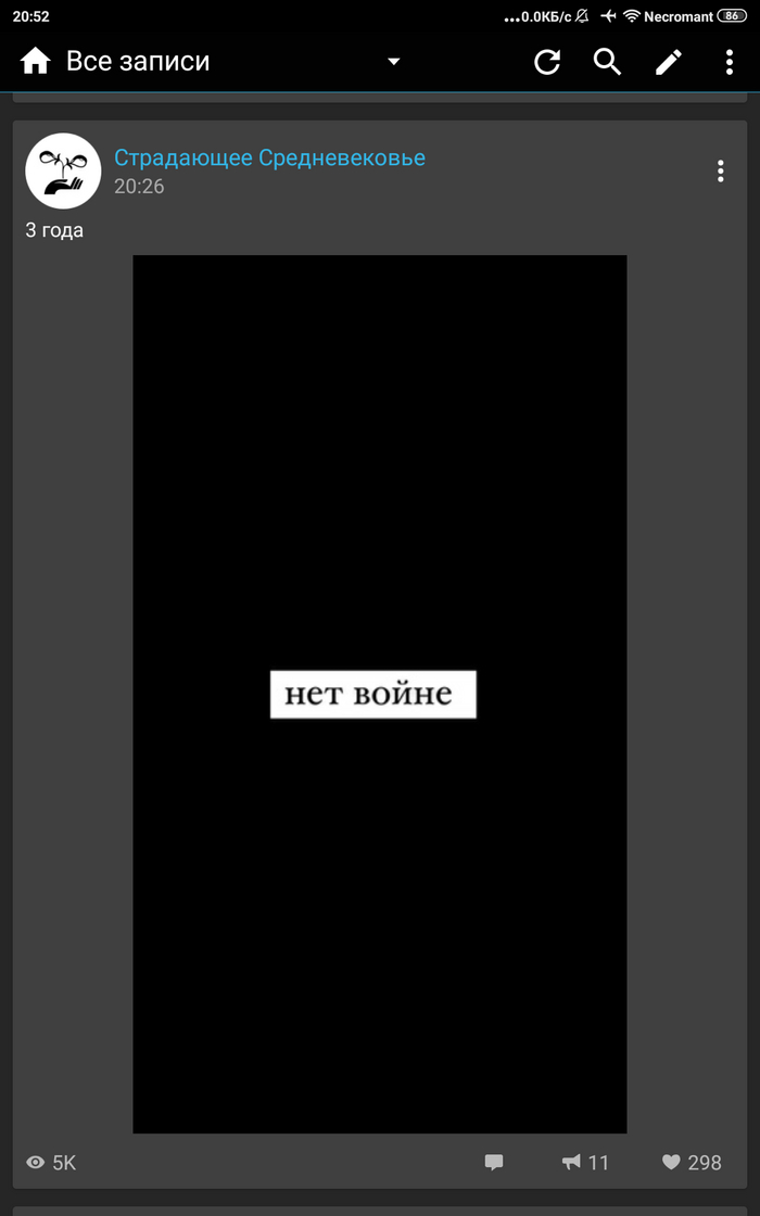 Есть такой паблик в контакте , страдающее средневековье где мемы про средневековые гравюры смешиваются с злободневными темами нашей политики. И вот уже третий год они борются с режимом. То про невинно осуждённых, то про преступление солдат российской армии, но не украинской. Это их борьба.