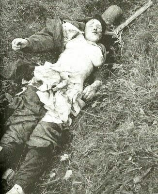 4. Красноармейцу Баранову в грудь нанесено 6 штыковых ран, на обеих пятках крестообразные раны.