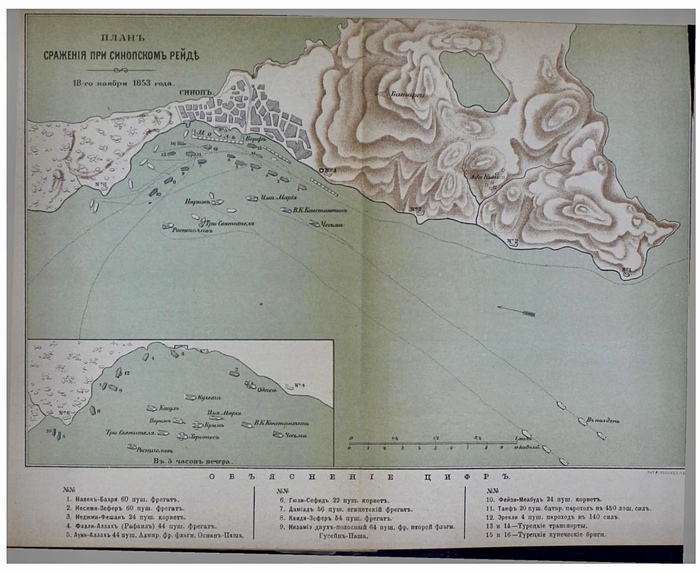 «ПРИКАЗ вице-адмирала Нахимова, по эскадре Черноморского Флота, 17 ноября 1853 года. Располагая припервом удобном случае атаковать неприятеля, стоящего в Синопе, в числе 7 фрегатов, 2 корветов, одного шлюпа, двух пароходов и двух транспортов, я составил диспозицию для атаки их, и прошу командиров стать по оной на якорь и иметь в виду следующее: 1) При входе на рейд,бросать лоты, ибо может случиться, что неприятель перейдёт на мелководие и тогда на возможном близком от него расстоянии, но на глубине не менее 10 сажень. 2) Иметь шпринг на оба якоря, если при нападении на непрятеля будет ветр N, самый благоприятный, тогда вытравить цепи 60 сажень, иметь столько же и шпрингу, предварительно заложенного на битенг; идя же на фордевинд при ветре O или ONO, во избежание бросания якоря с кормы, становиться также на шпринг, имея его до 30 сажень, и когда цепь вытравленная до 60 сажень дёрнет, то вытравить ещё 10 сажень, в этом случае цепь ослабнет, а корабли будут стоять кормою на ветр на кабельтове; вообще со шпрингами быть крайне осмотрительными, ибо они часто остаются недействительными от малейшего невнимания и промедления времени. 3) Пред входом в Синопский Залив, если позволит погода, для сбережения гребных судов на рострах, я сделаю сигнал спустить их на воду и тогда иметь их у борта на протовулежащей стороне неприятеля, имея на одном из них, на всякий случай, кабельтов и верп. 4) При атаке иметь осторожность, не палить даром по тем из судов, кои спустят флаги; посылать же для овладения ими не иначе как по сигналу адмирала, стараясь лучше употребить время для поражения противящихся судов или батарей, которыя без сомнения не перестанут палить, если бы с неприятельскими судами дело было б кончено. 5) Ныне же осмотреть заклёпки у цепей, на случай надобности расклепать их. 6) Открыть огонь по неприятелю, по второму адмиральскому выстрелу, если пред тем со стороны неприятеля не будет никакого сопротивления нашему на них наступлению; в противном случае, палить как кому возможно, соображаясь с расстоянием до неприятельских судов. 7) Ставь на якорь и уладив шпринг, первые выстрелы должны быть прицельные; при этом хорошо заметить положение пушечного клина на подушке мелом, для того, что после в дыму не будет видно неприятеля, а нужно поддерживать быстрый батальный огонь; само собою разумеется, что он должен быть направлен, по тому же положению орудия, как и при первых выстрелах. 8) Атакуя неприятеля на якоре, хорошо иметь, как и под парусами, одного офицера на грот-марсе или салинге, для наблюдения при батальном огне за направлением своих выстрелов, и буде они не достигают своей цели, офицер сообщает о том на шканцы, для направления шпринга. 9) Фрегатам Кагул и Кулевичи, во время действия, остаться под парусами, для наблюдения за неприятельскими пароходами, которые, без сомнения, вступят под пары и будут вредить нашим судам, по выбору своему. 10) Завязав дело с неприятельскими судами, стараться по возможности не вредить консульским домам, на коих будут подняты национальные их флаги. В заключение я выскажу свою мысль, что все предварительные наставления, при переменившихся обстоятельствах, могут затруднить командира, знающего своё дело, и потому я предоставляю каждому совершенно-независимо действовать по усмотрению своему, но непременно исполнить свой долг. Государь Императ