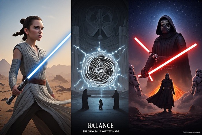 Финал: Хранители, видя в Реи и Кайло первый за тысячелетия третий путь, соглашаются. Они не исчезают, но отступают в тень вечных наблюдателей. Рей и Кайло (искупленный, но не «светлый» в старом смысле) основывают Орден Целостности, где сила — это не выбор между светом и тьмой, а искусство удерживать их в напряжённом, живом единстве. Кадр: Рей и Кайло вдвоём, не как романтическая пара, а как два полюса одного целого, смотрят на карту галактики, где теперь горят не точки Света или Тьмы, а мерцающие точки потенциального равновесия.