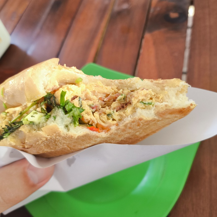 Минут через 7 мне принесли горяченький багет с мясом, яйцом и зеленью. Что ж, это, конечно, не Том ям (да, его я ел), но начинать же с чего-то надо? Вкуснятина.
