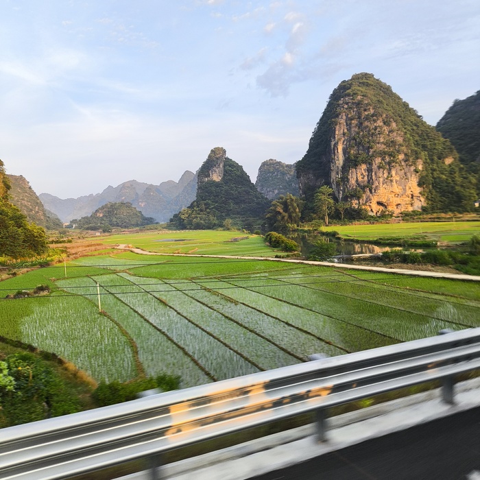 Рисовые поля покрывают каждый дюйм плодородной почвы, где-то то и дело мелькают ручьи. Кругом, казалось бы, первозданные долины, но пару раз из-за скал я видел и выглядывающие многоэтажки этажей по 20.