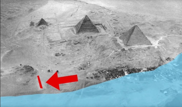 Он добавил: «Это поместит отсутствующую пирамиду немного прямо к западу от приблизительной оси трех основных пирамид на том, что выглядит как плоская подготовленная земля.
