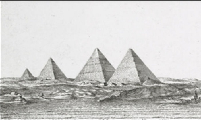 Интересно, что описание и иллюстрации Нордена превосходного качества, и они помещают четвертую, черную пирамиду на некотором расстоянии от трех пирамид Гизы.