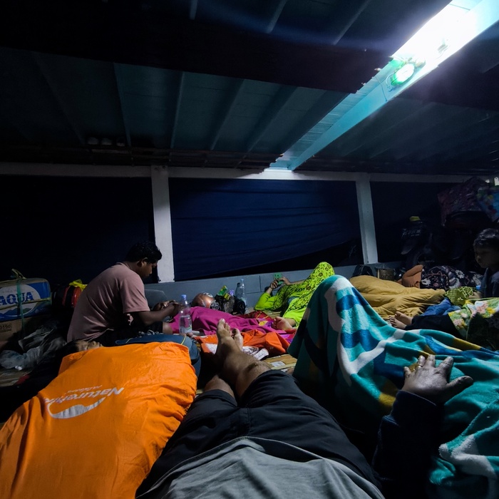Вчера чуть иначе закрепил москитную сетку - прибил гвозди по углам "каюты" и повешал её внутри, тем самым полностью исключив возможность проникновения. Эксперимент оправдал себя! На утро ни одного комара внутри. Сейчас вычерпаю воду из лодки и в путь-дорогу!